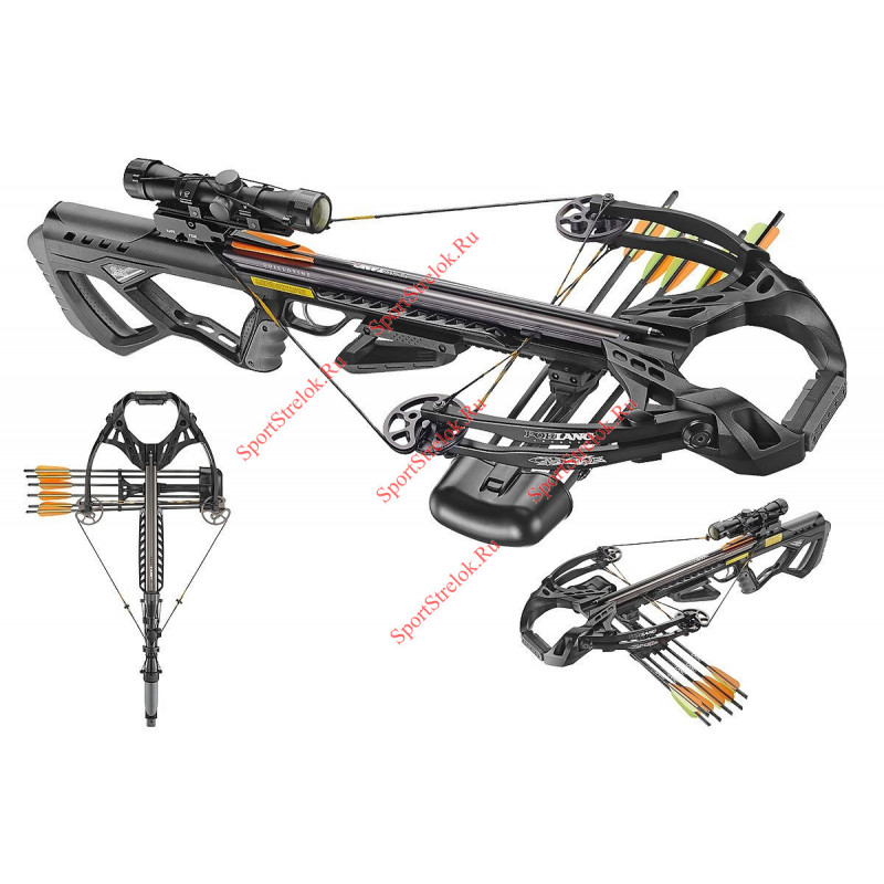 Полная комплектация: Оптический прицел 4х32, Ремень, Кивер для стрел, Натяжитель тетивы, Стрелы карбоновые арбалетные 3шт, Сборочный комплект, Воск для тетивы, Виброгасители на плечах.