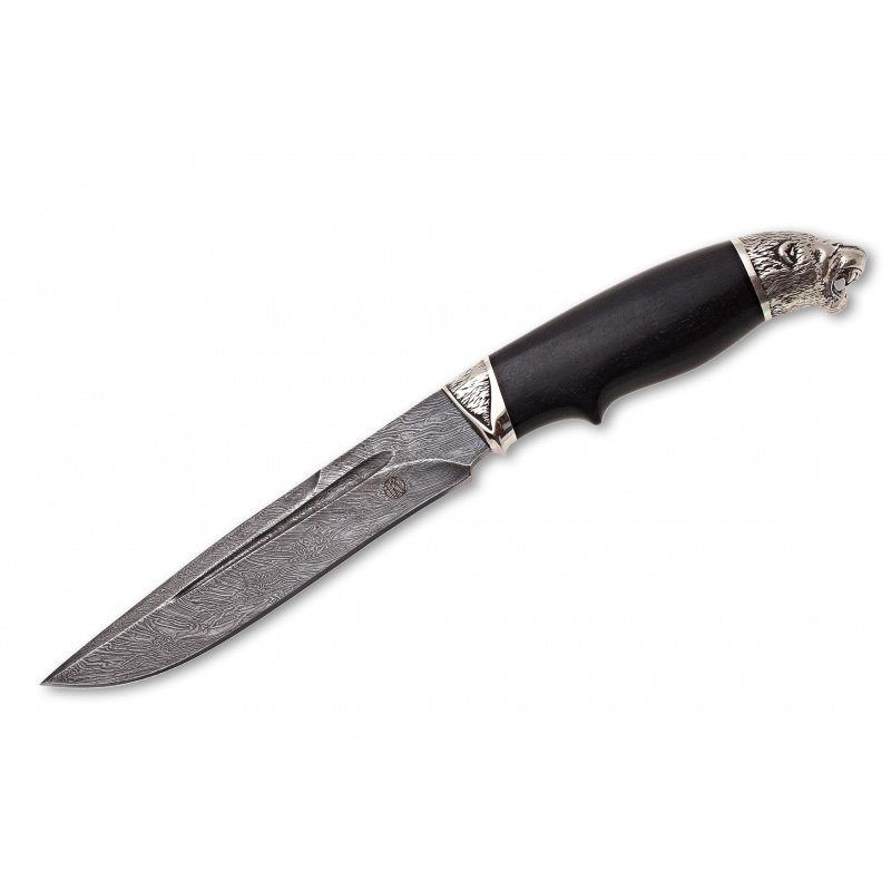 Нож Хищник дамасская сталь, оформление серебро, рукоять дерево граб. Прекрасная художественная работа для ценителей дамасска, нож имеет несравнимые качества реза с другими сталями благодаря слоёной структуре кованного пакета сталей, а так же ударную вязкость и поглощения вибраций. Но в замен данных качеств клинок ножа требует за собой тщательного ухода, так как стойкости от коррозии практически нет.