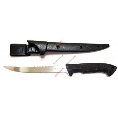 Нож станет Вашим помощником не только в быту, но и в туристических поездках.Эргономичная рукоять имеет удобный выступ под палец, что придает дополнительную уверенность при работе с ножом. Рукоять изготовлена из эластрона. Этот материал не нуждается в представлении, так как за долгие годы хорошо себя зарекомендовал, как надежный и практичный материал, который не один год используется в производстве наших ножей. Толщина клинка всего 1.7 мм. что в совокупности с клиновой заточкой придает ножу исключительные режущие свойства. Серрейтор, нанесенный на обухе, поможет эффективно очищать чешую с рыбы и перепиливать крупные кости. Чехол изготовлен из ударопрочного АБС пластика с удобным поворотным поясным креплением.